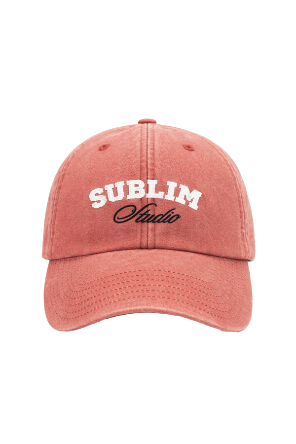 Gorra color naranja vintage con efecto lavado confeccionada en algodón. Presenta logotipo de SUBLIM Studio bordado a contraste en color crema y azul. Cuenta con cierre ajustable mediante hebilla metálica.