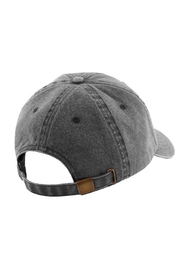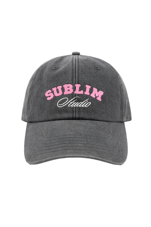 Gorra gris con efecto lavado confeccionada en algodón. Presenta logotipo de SUBLIM Studio bordado a contraste en color rosa y blanco. Cuenta con cierre ajustable mediante hebilla metálica.
