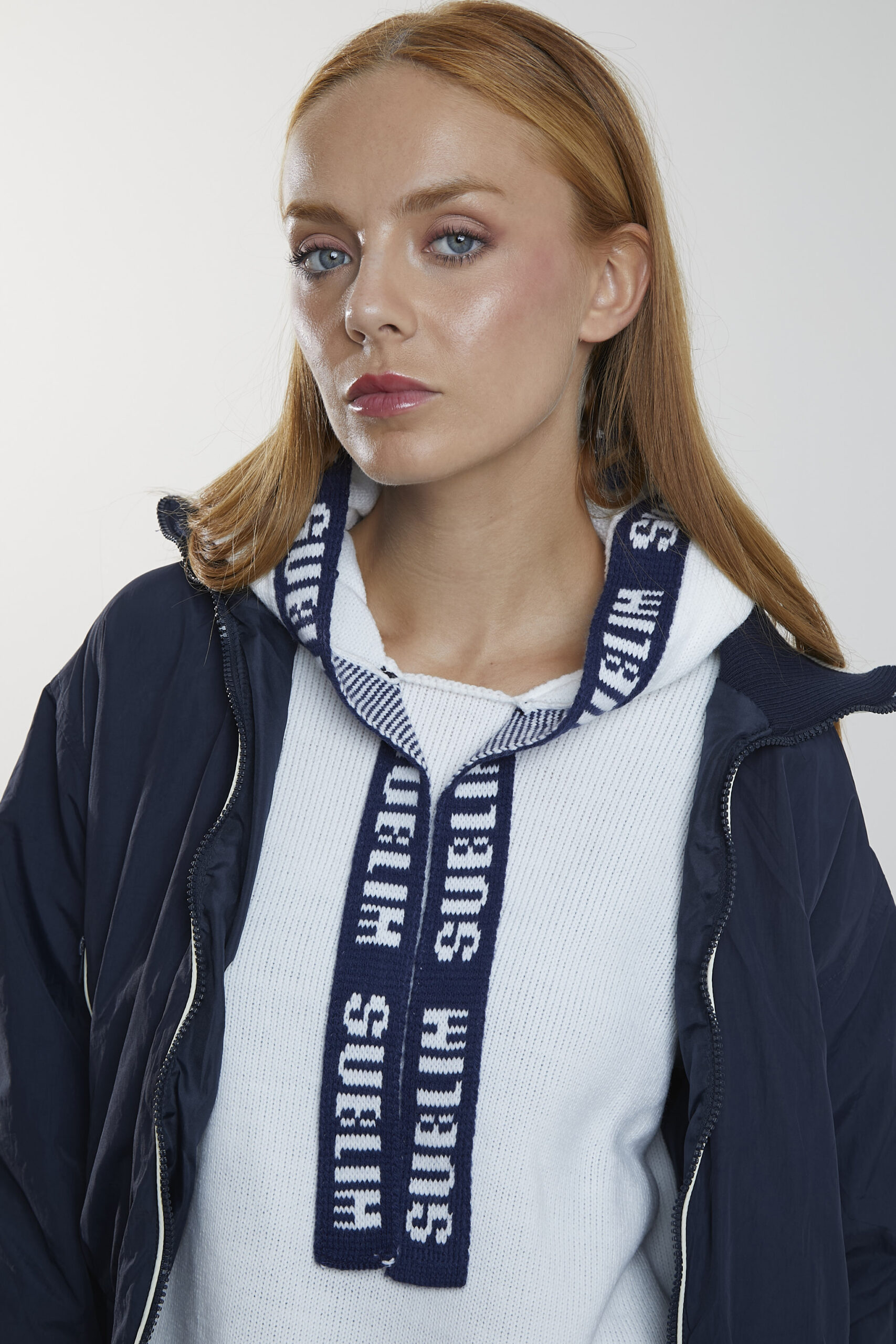 Jersey de punto en color crudo, con capucha incorporada y manga larga. Presenta tiras en color azul marino con la palabra SUBLIM en crudo, aportando un detalle distintivo al diseño.