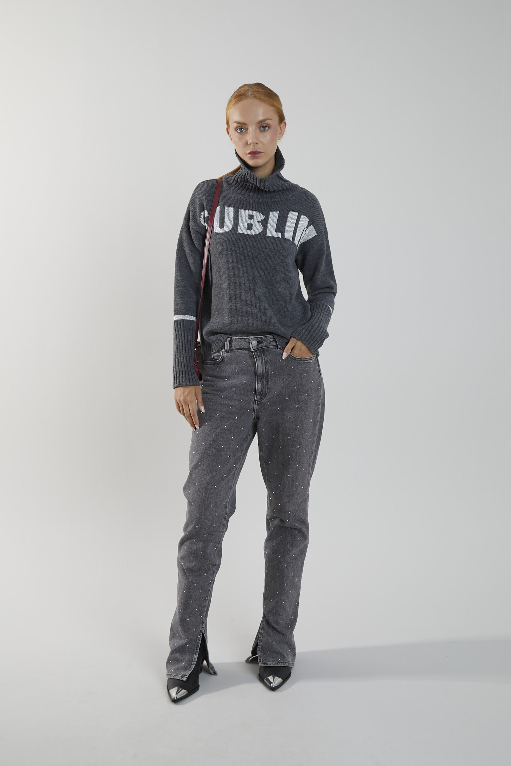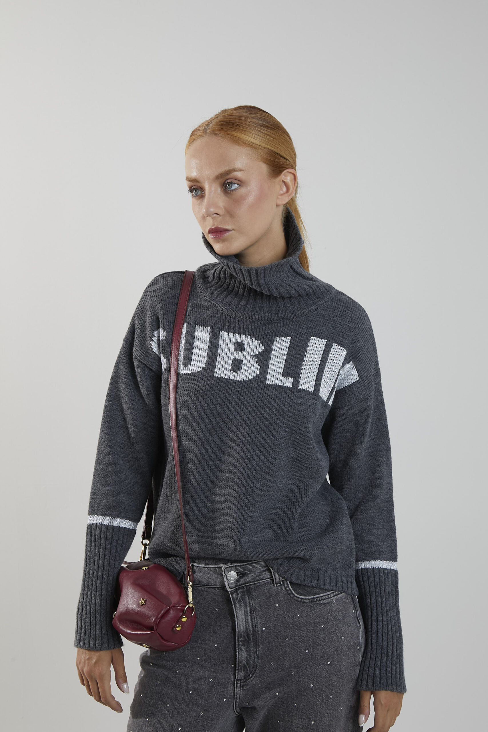 Jersey de punto color gris oscuro, con cuello alto y manga larga. Contiene la palabra SUBLIM en color crudo con acabado brillante, en la parte frontal de la prenda. Las mangas incluyen una línea en contraste en el mismo tono y con el mismo efecto brilli brilli, que aportan un toque sofisticado y único.