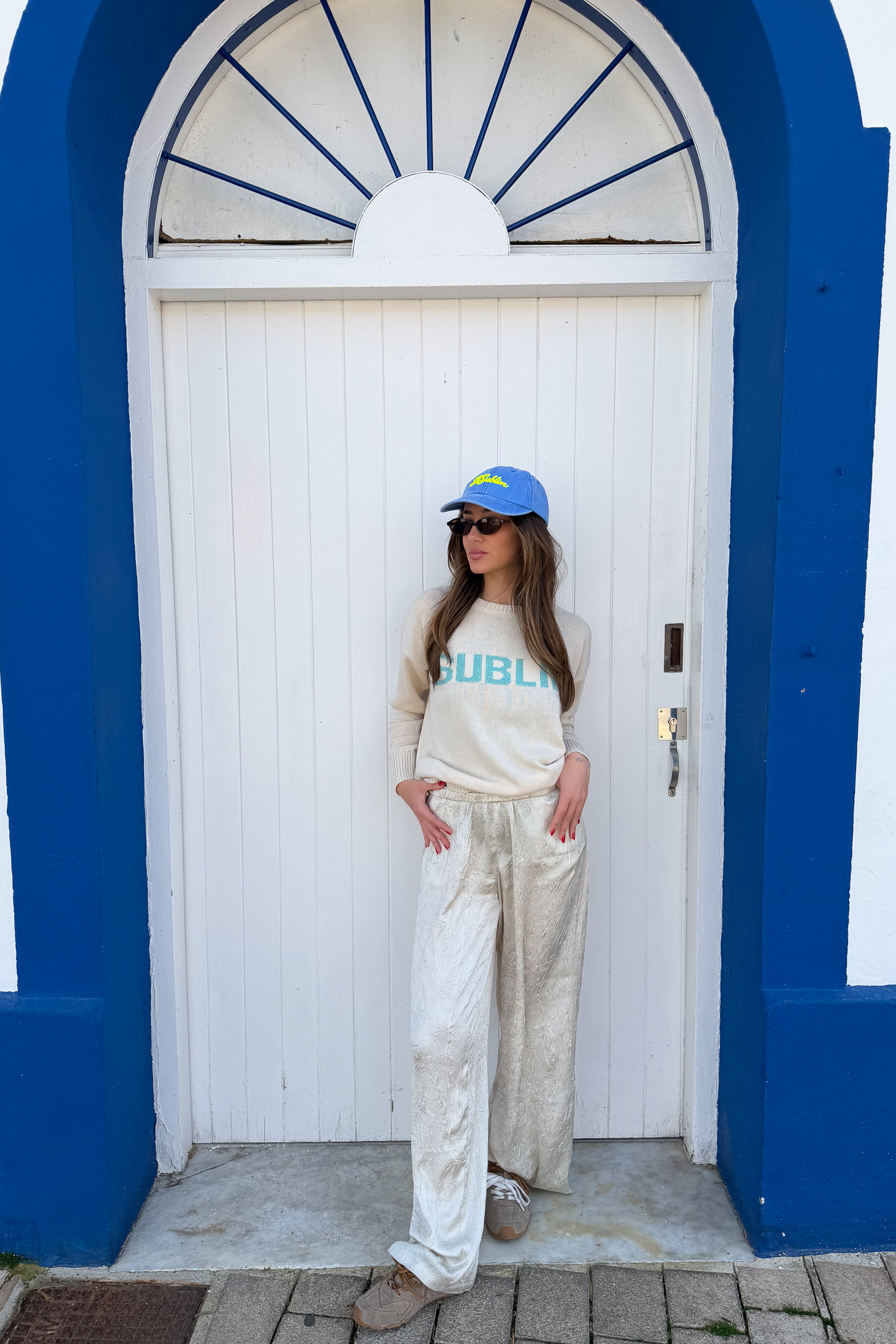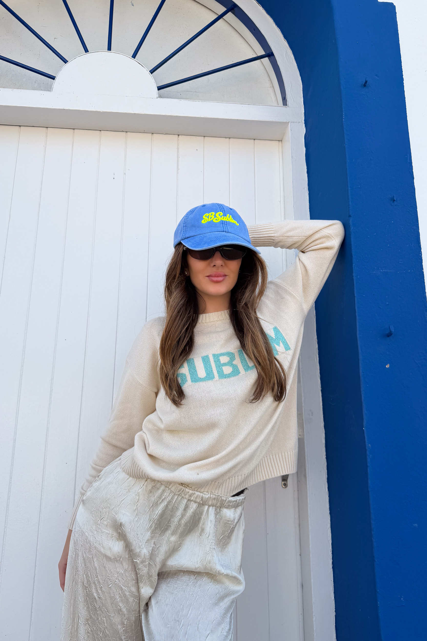Jersey de primavera en color arena, con cuello redondo y manga larga. Contiene la palabra SUBLIM en turquesa con acabado en lurex.