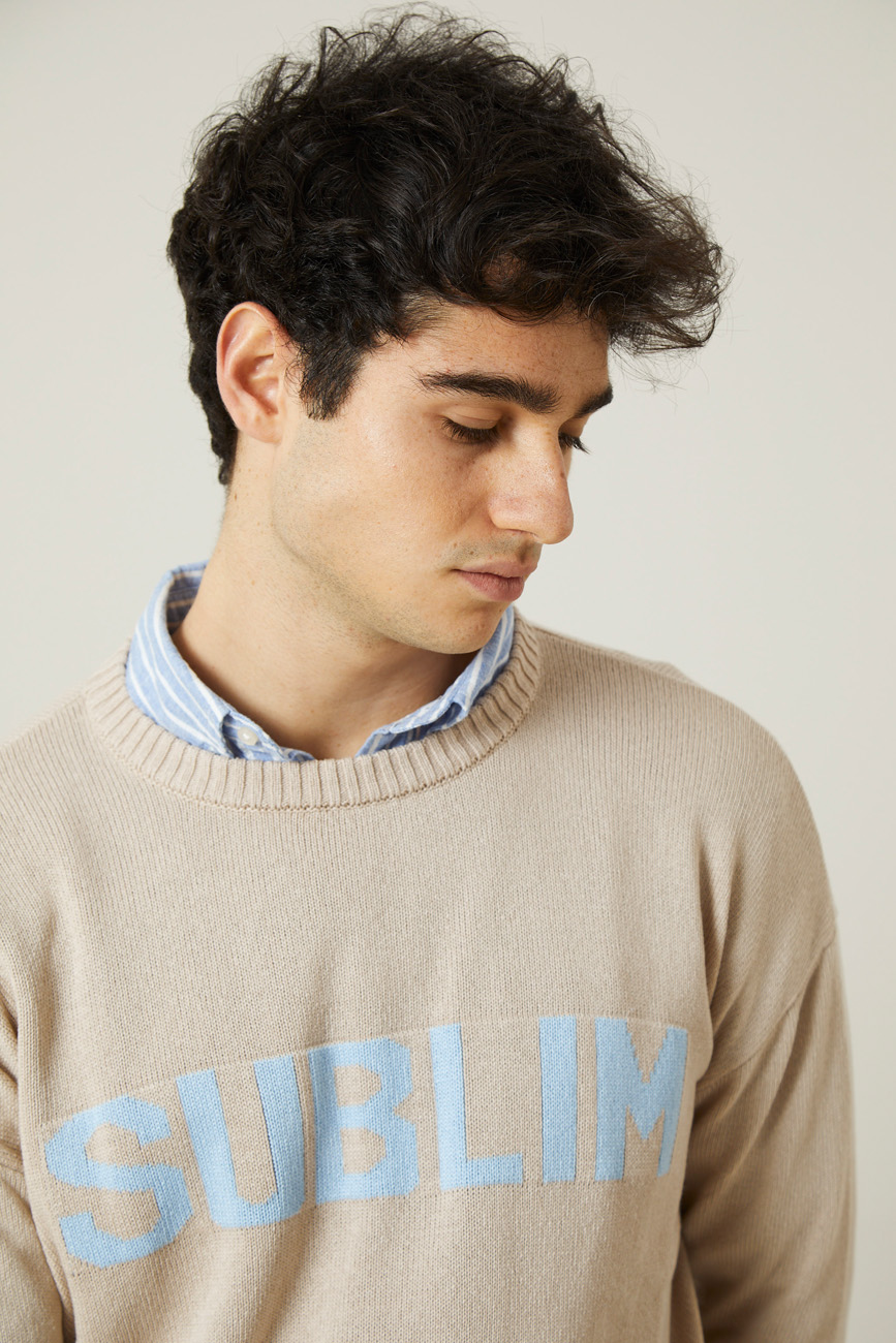 Jersey de punto liso en color beige, con cuello redondo y manga larga. Su diseño ligero y acabados en canalé aportan un toque de distinción a un básico atemporal.