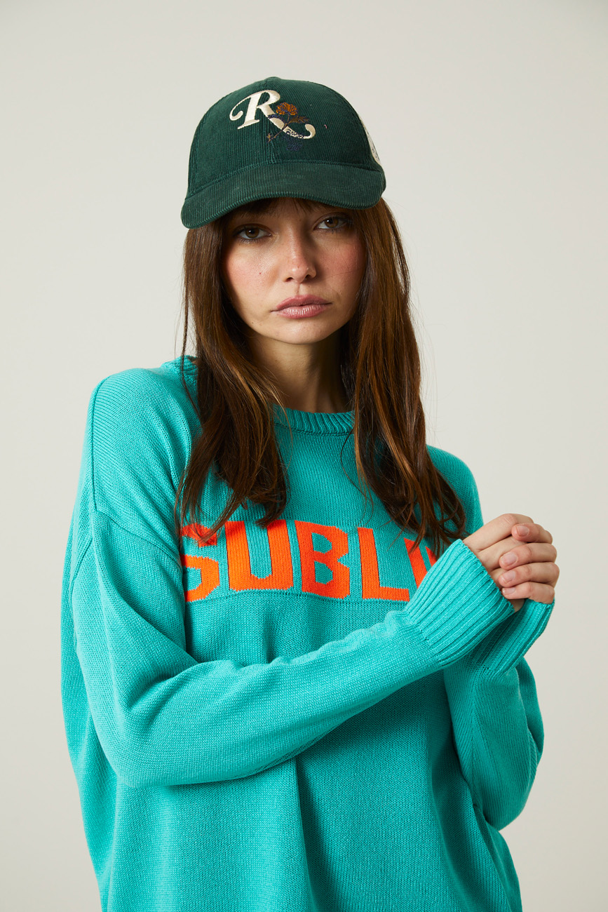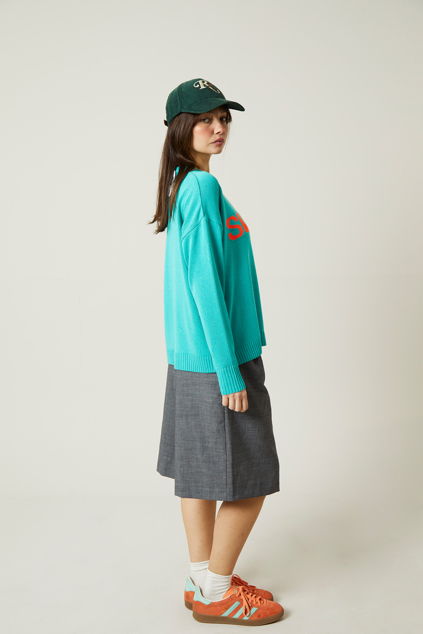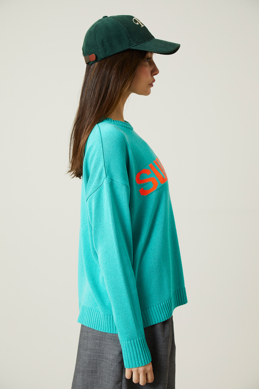 Jersey de punto liso en color turquesa, con cuello redondo y manga larga. Su diseño ligero y acabados en canalé aportan un toque de distinción a un básico atemporal.