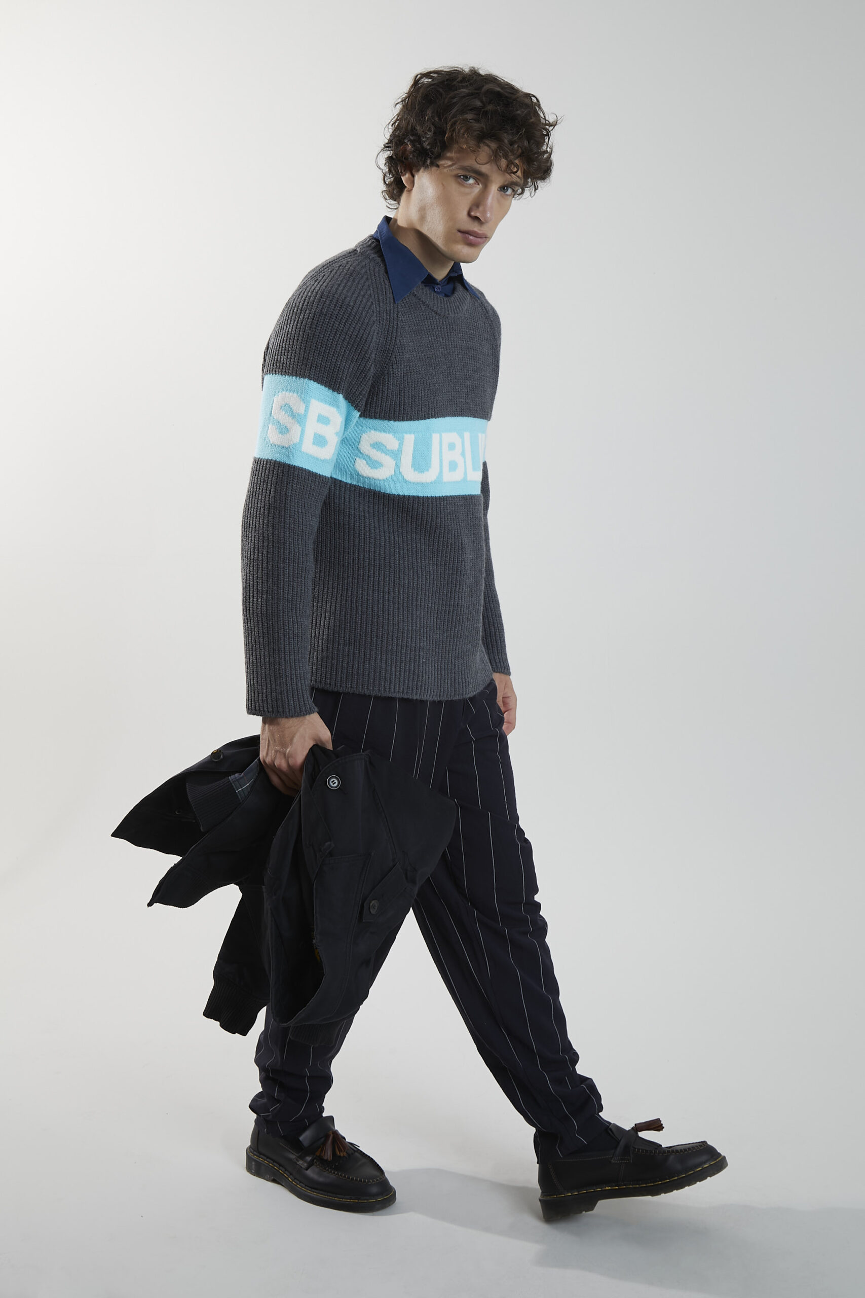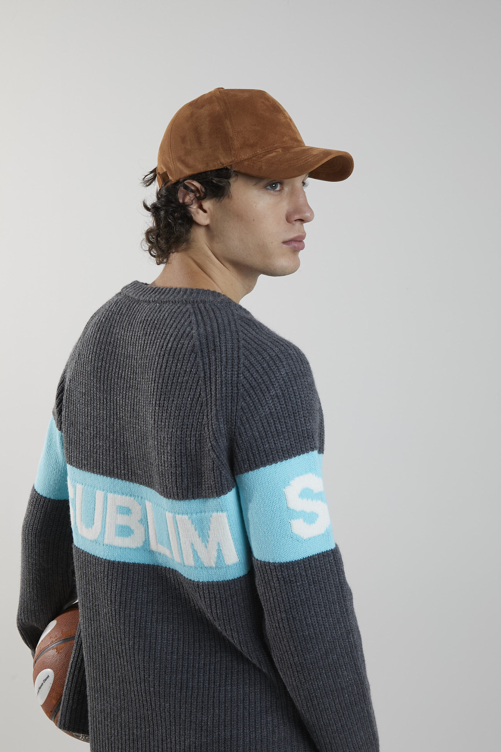 Jersey de punto en color gris oscuro, con cuello redondo y manga larga. Contiene la palabra SUBLIM en blanco, integrada en una franja turquesa que recorre el pecho y las mangas.
