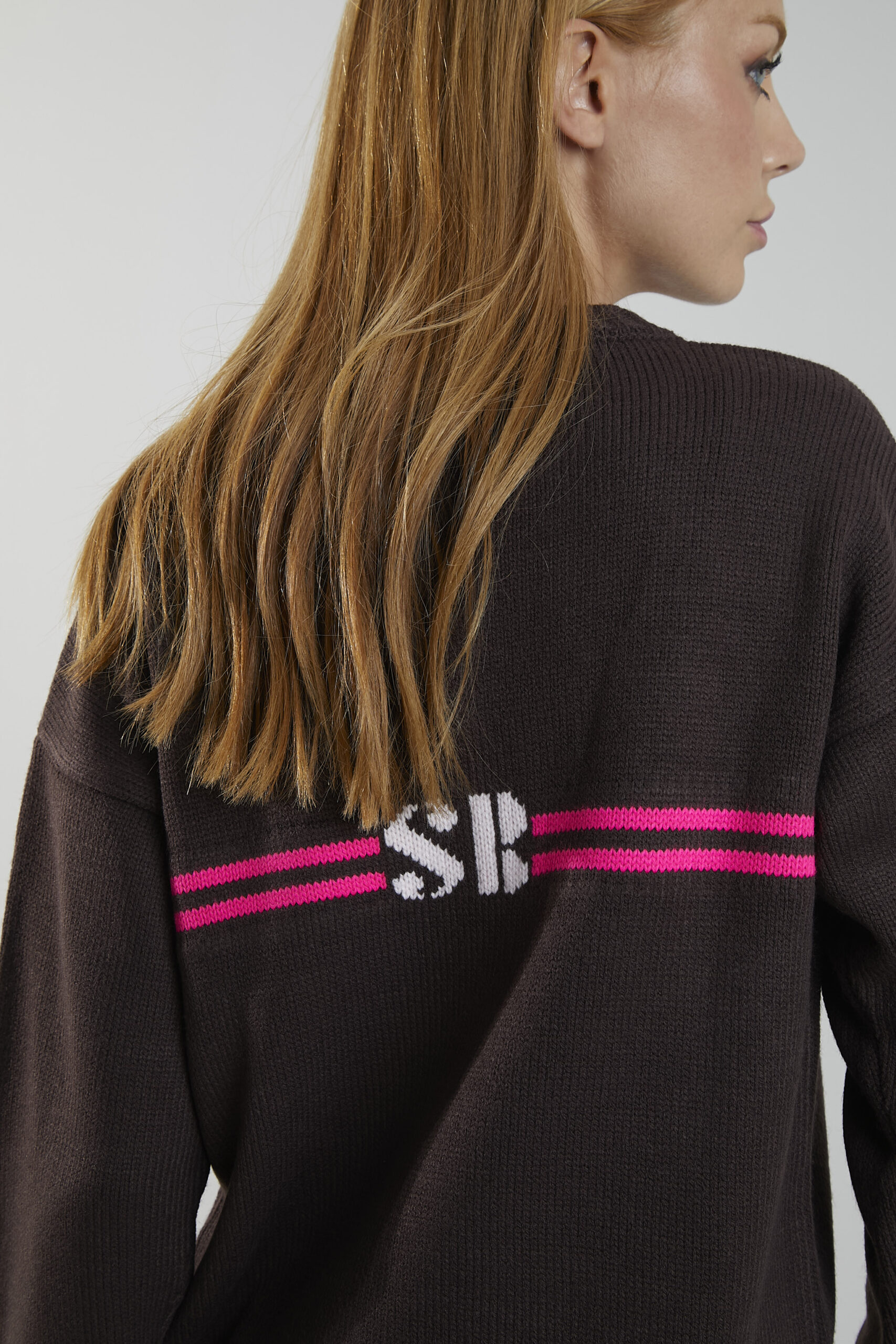 Jersey de punto en color marrón, con cuello redondo y manga larga. Presenta la palabra SUBLIM en color rosa con el mensaje “MADE IN BCN” justo debajo, acompañado de dos líneas horizontales en color fucsia a ambos lados.