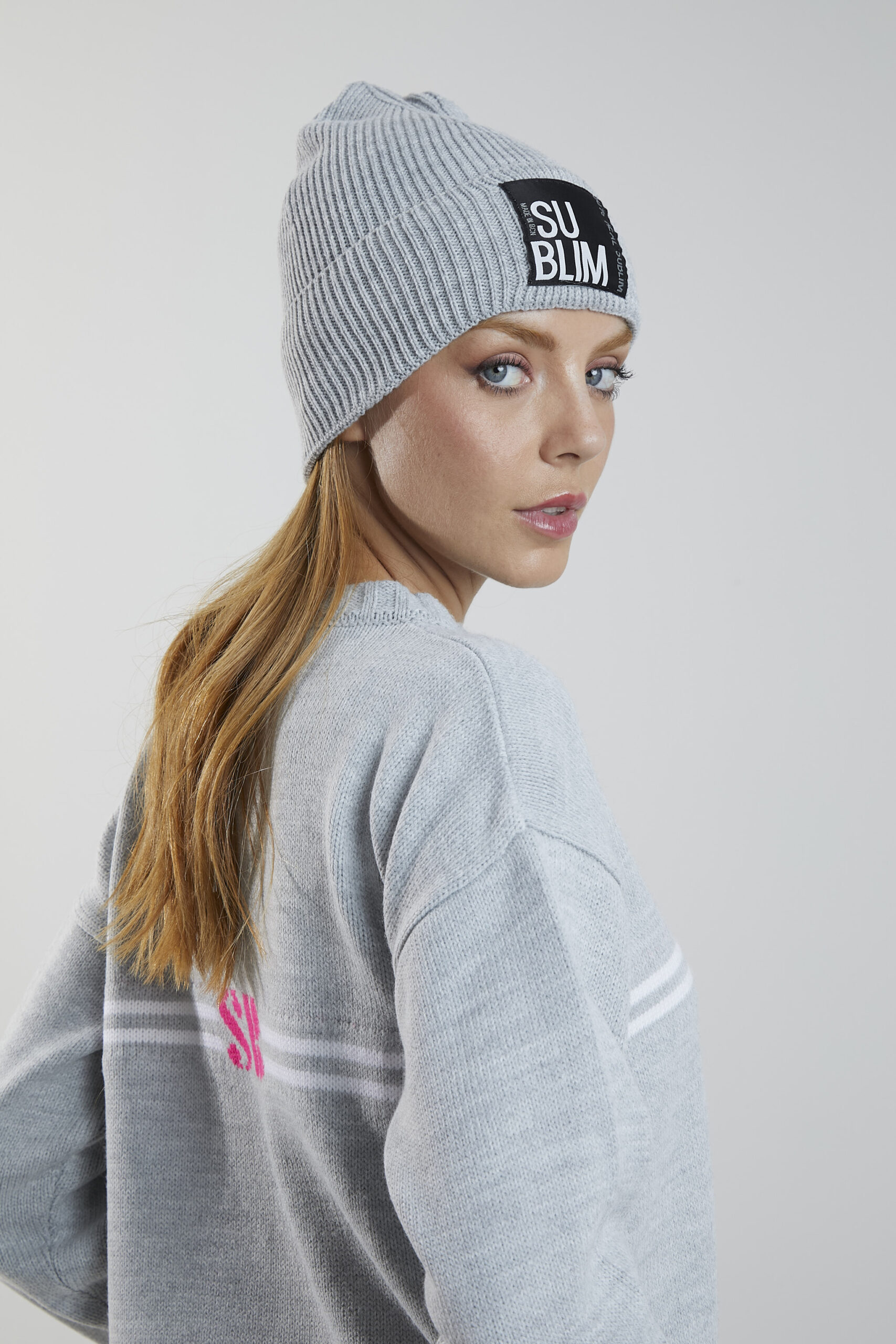 Jersey de punto en color perla, con cuello redondo y manga larga. Presenta la palabra SUBLIM en color fucsia con el mensaje “MADE IN BCN” justo debajo, acompañado de dos líneas horizontales en color blanco a ambos lados.