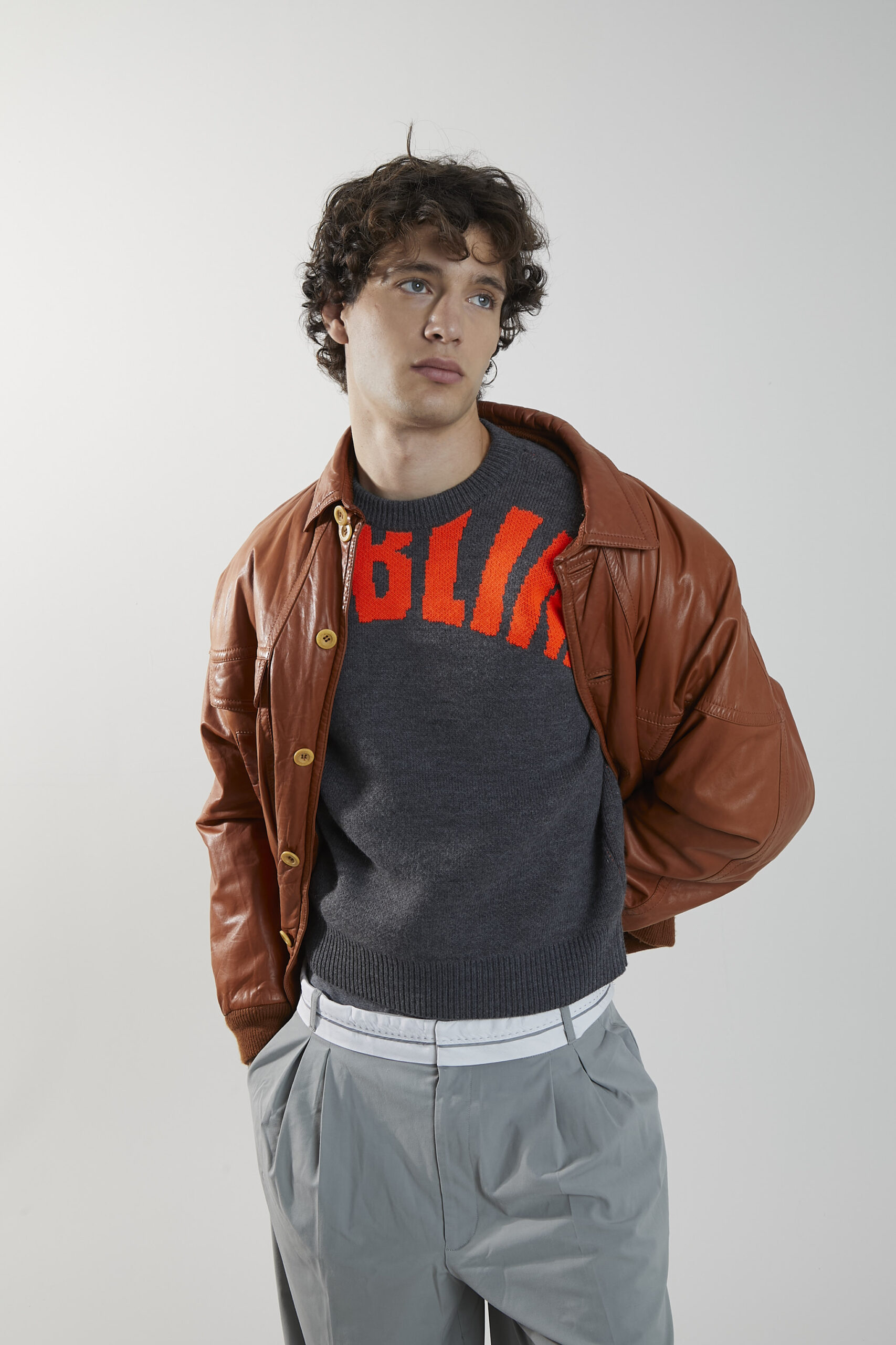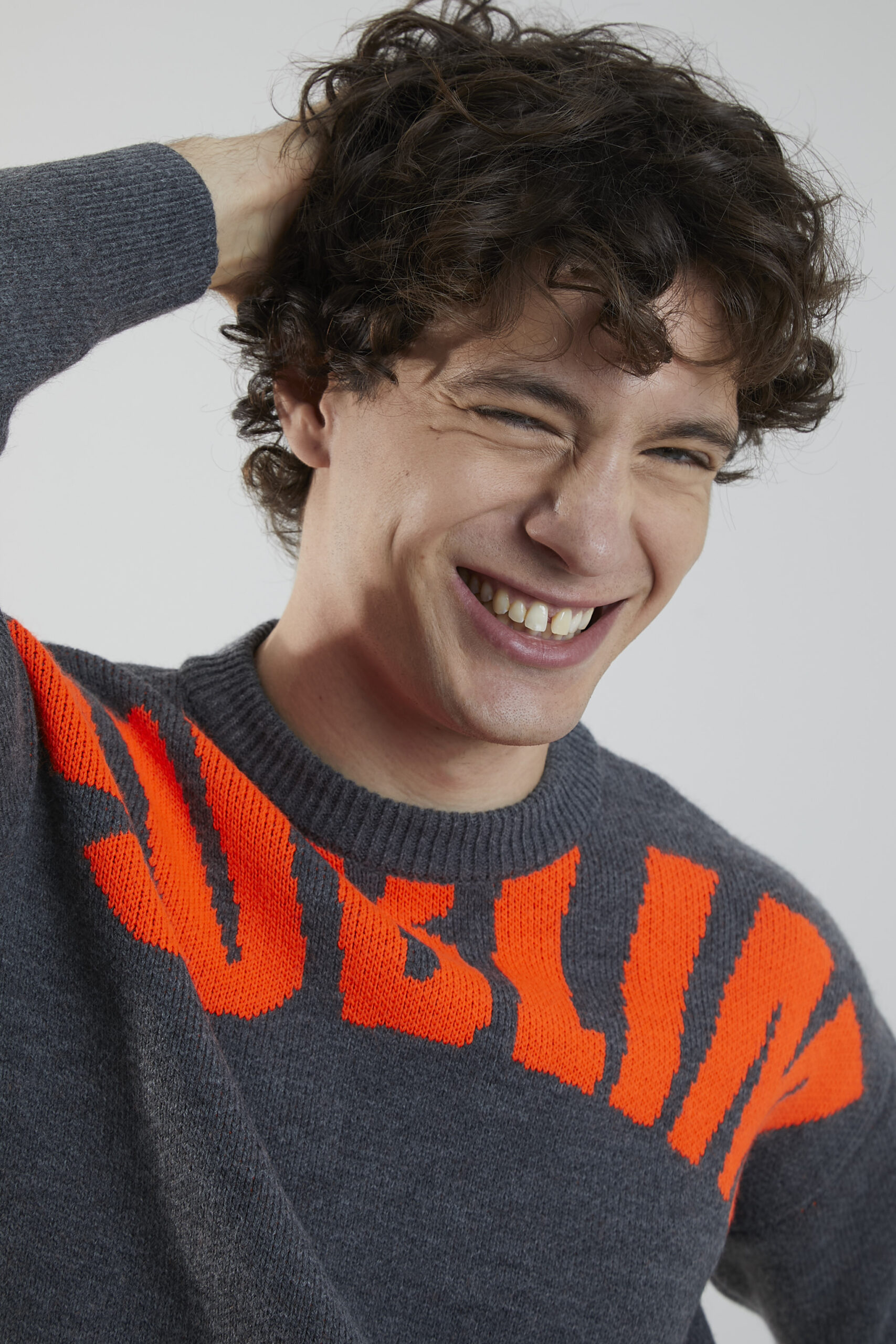 Jersey de punto en color gris oscuro, con cuello redondo y manga larga. Destaca por el diseño gráfico en el frontal, con la palabra SUBLIM en color naranja flúor dispuesta en forma de arco, aportando un toque visual distintivo.