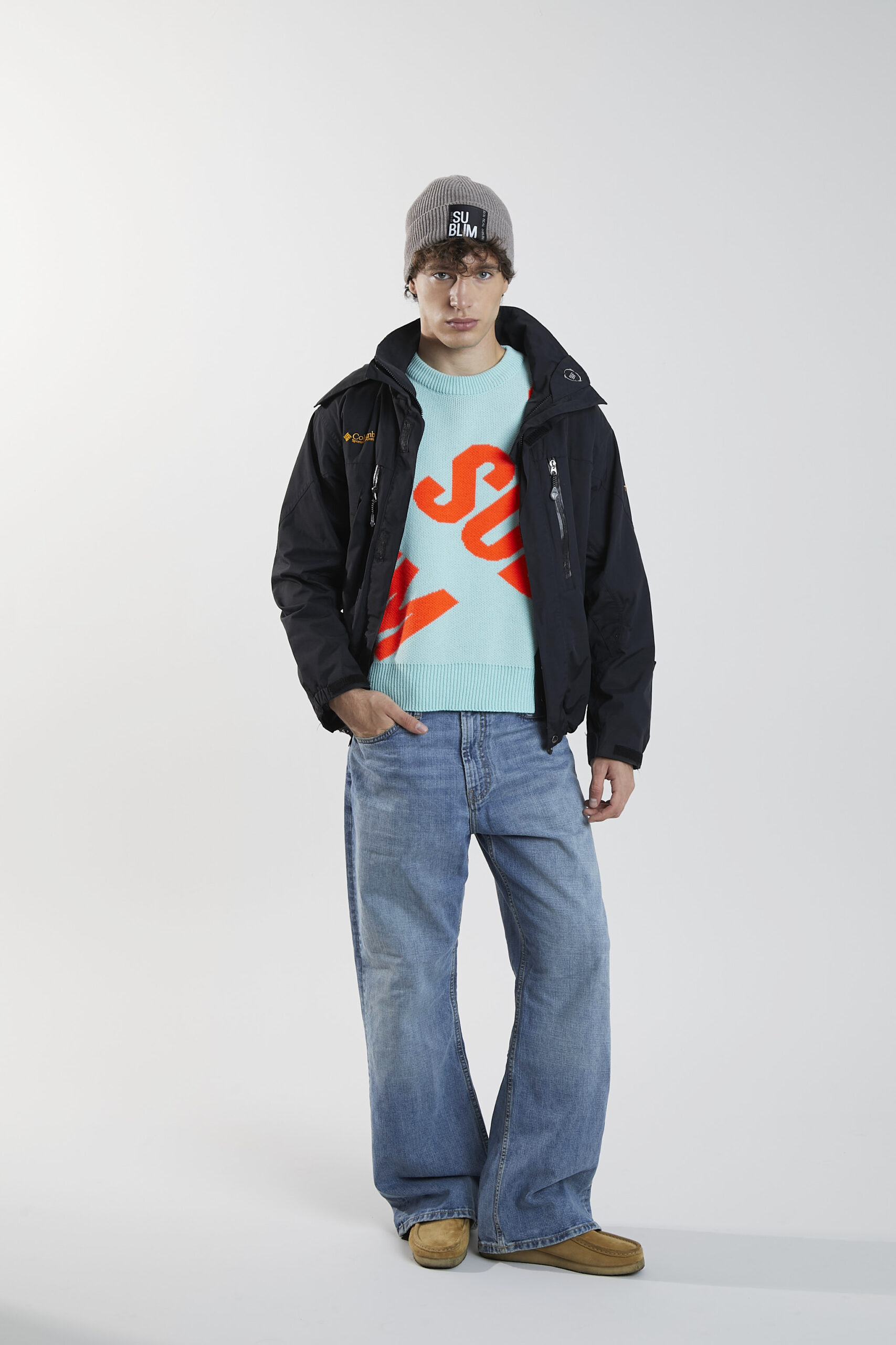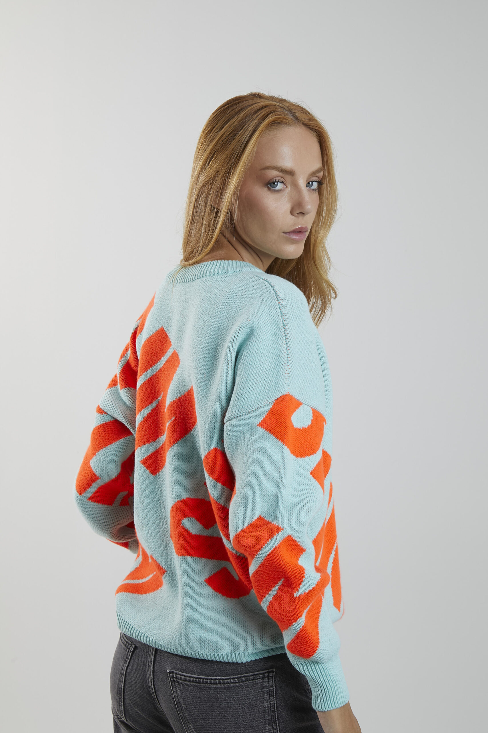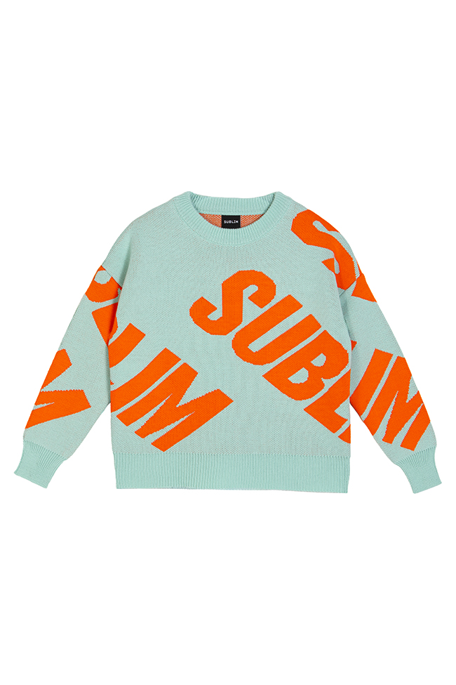 Jersey VS es nuestro jersey bestseller. Es un jersey de punto en color mar, con cuello redondo y manga larga. Contiene la palabra SUBLIM en color naranja flúor, presente en ambas mangas y en el frontal de la prenda.