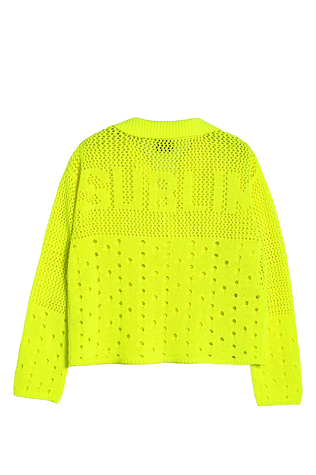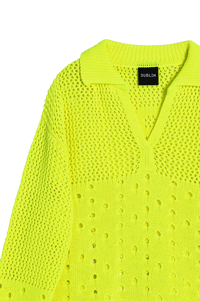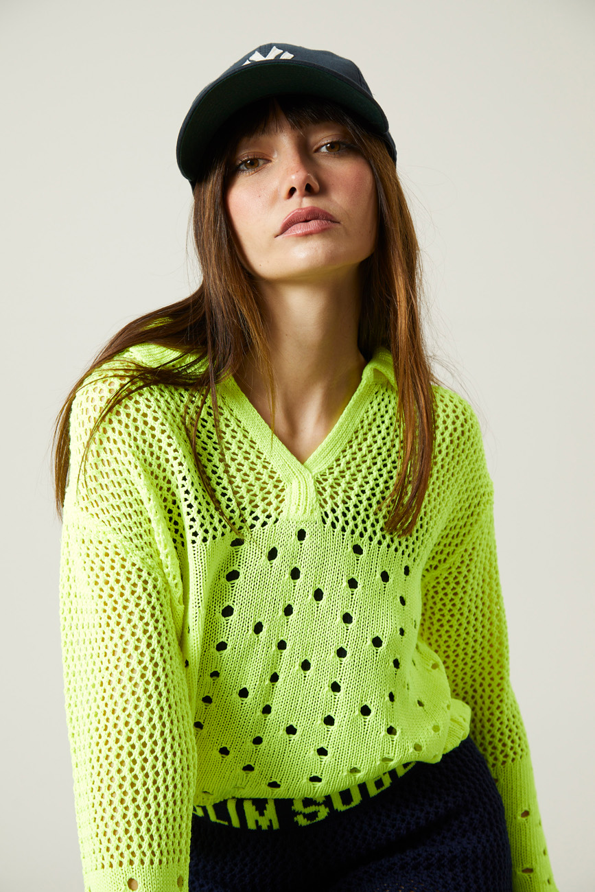 Polo calado de punto color flúor, con cuello de pico y manga larga. Su diseño ligero y su textura perforada aportan frescura y estilo a un básico con carácter.