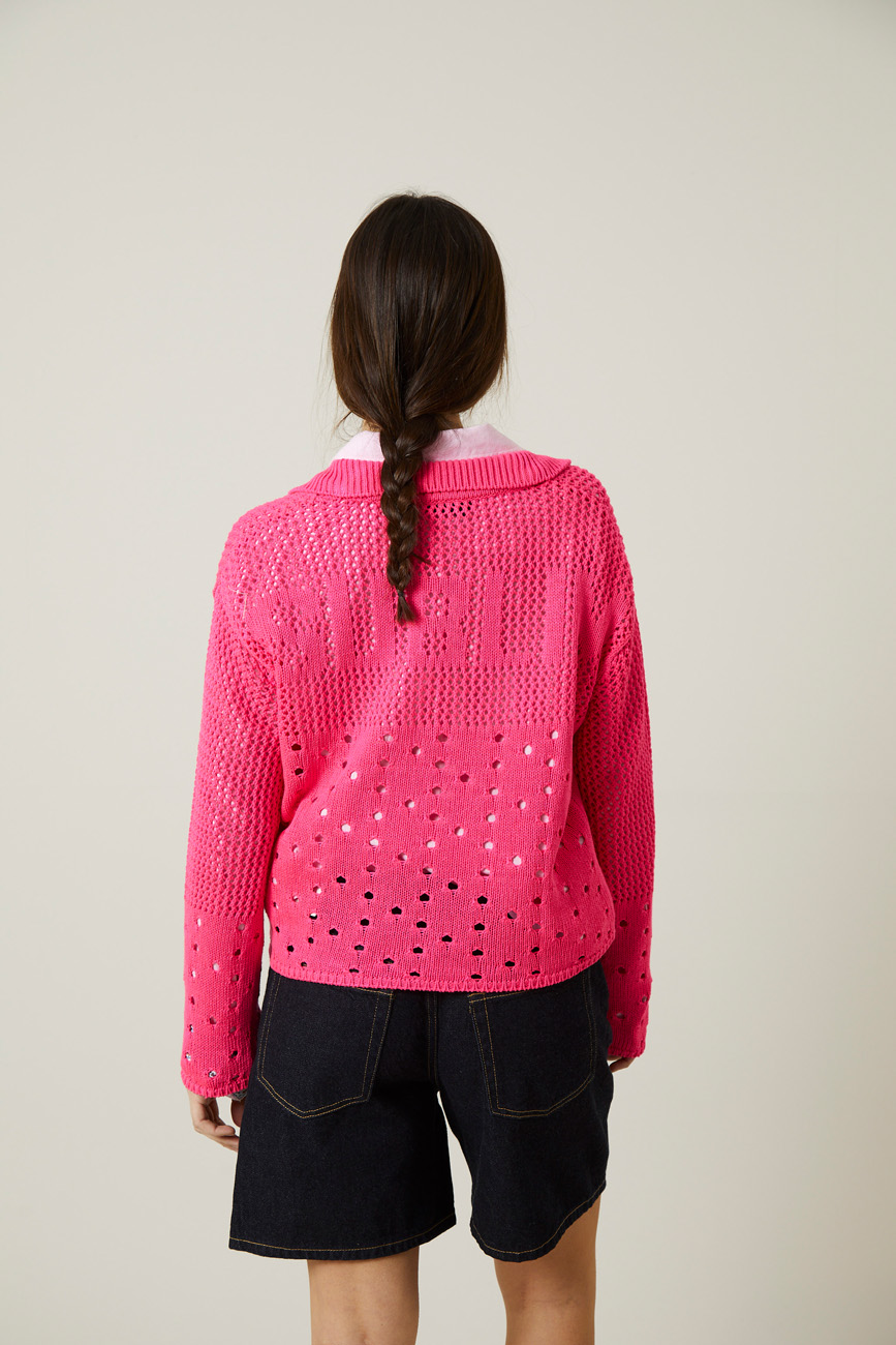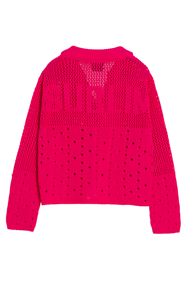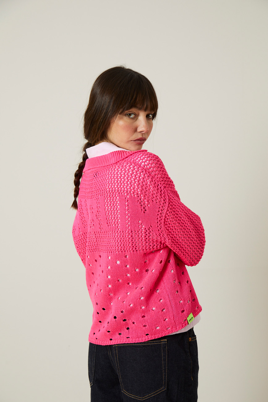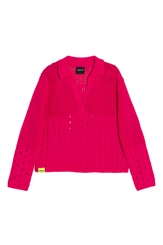 Polo calado de punto color fucsia, con cuello de pico y manga larga. Su diseño ligero y su textura perforada aportan frescura y estilo a un básico con carácter.