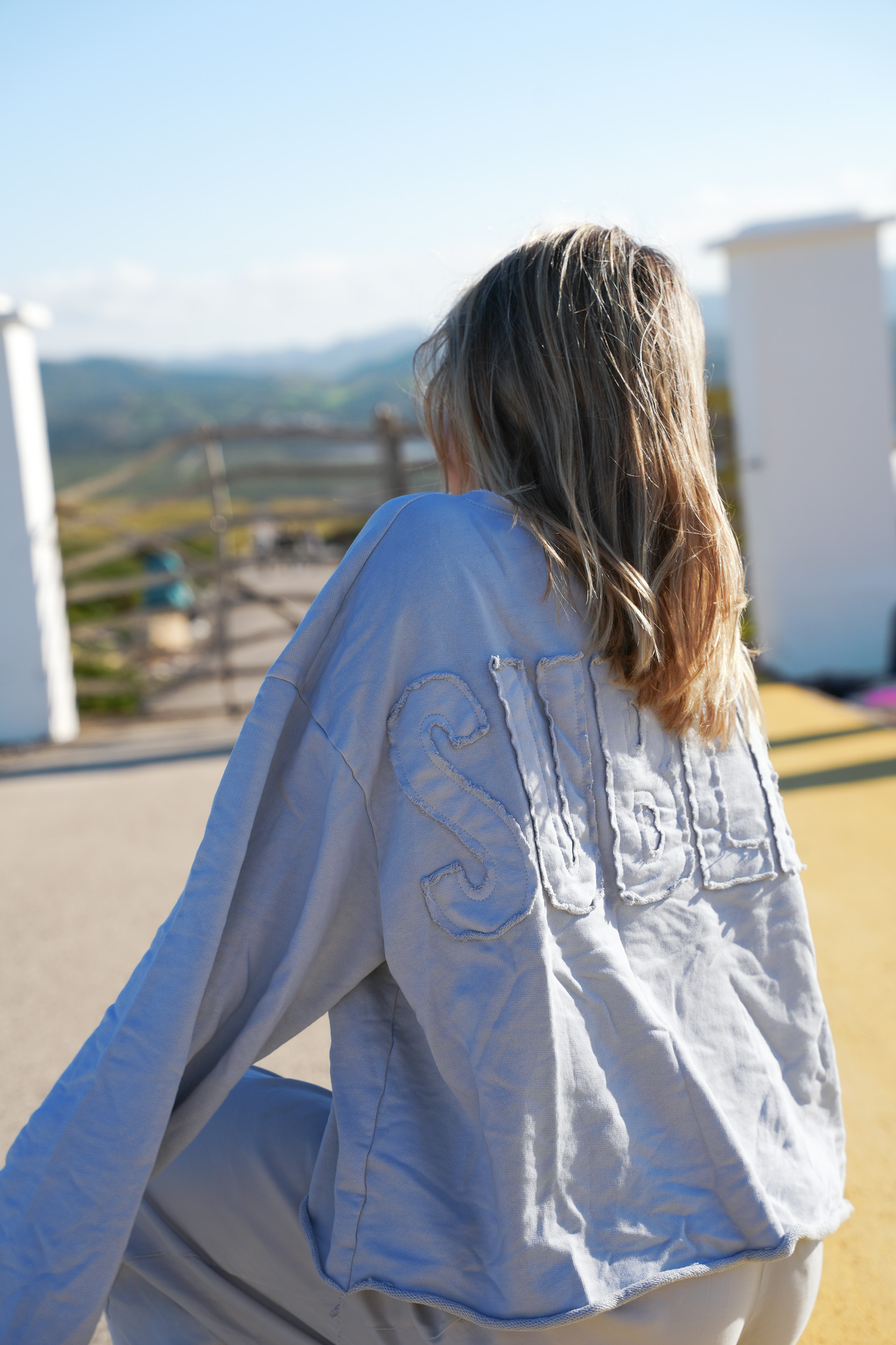 Sudadera oversize en color perla, con cuello redondo y manga larga.
